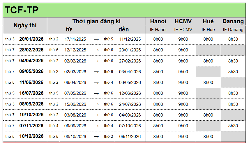 Các kỳ thi TCF-TP được tổ chức hàng tháng tại Hà Nội, TP. HCM và nhiều kỳ tại Huế & Đà Nẵng.
