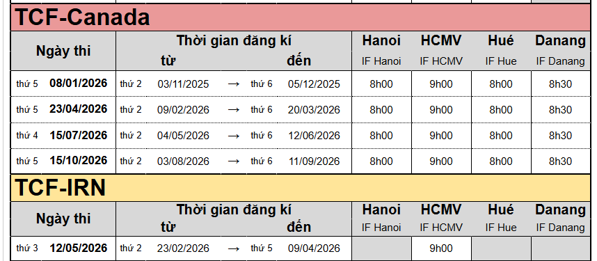 *Lịch thi TCF 2026 sẽ được cập nhật thường xuyên.
